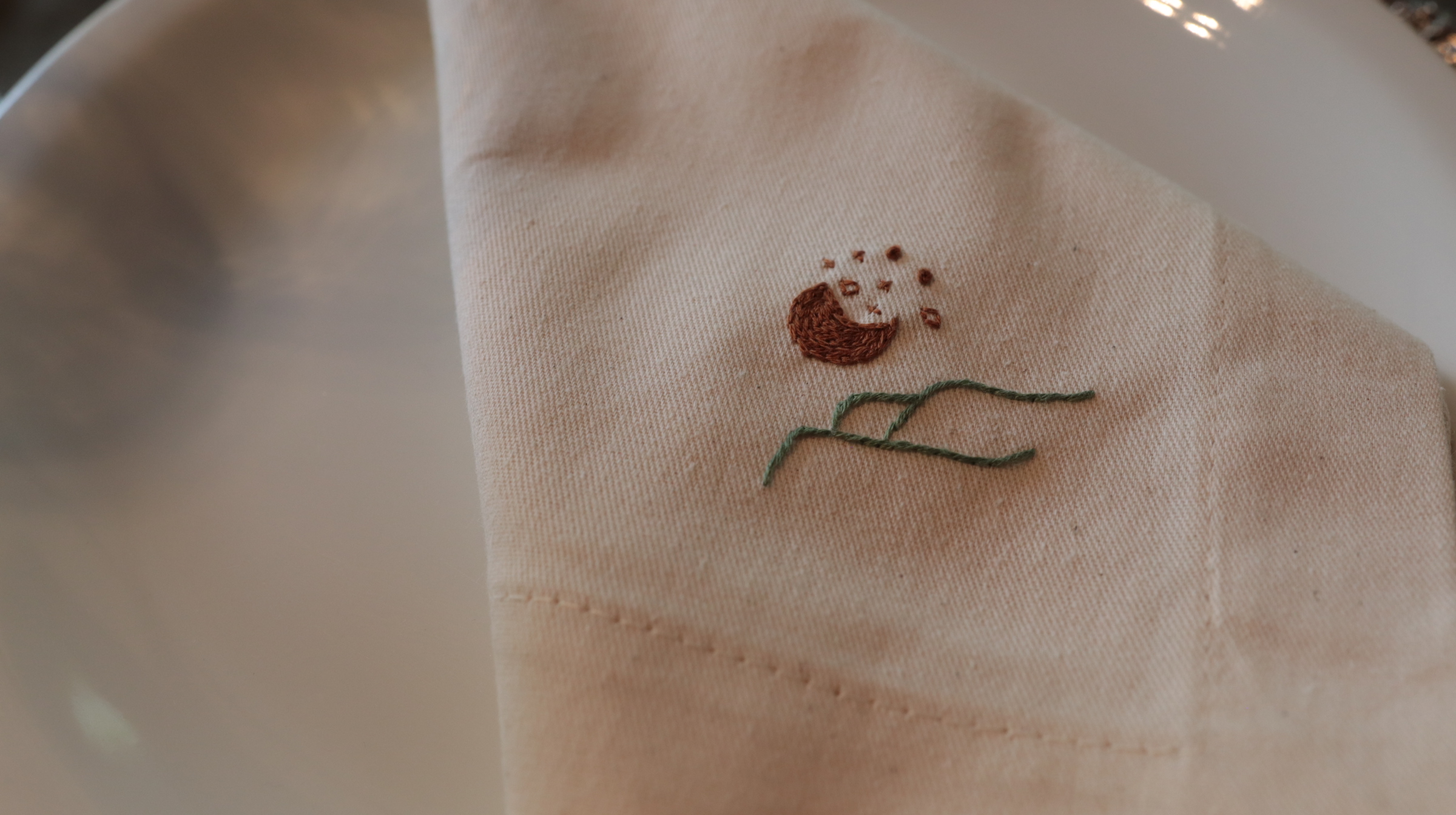 Monte uma mesa elegante com os guardanapos de tecido com bordado feito a mão,